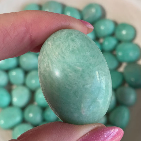 These beautiful Amazonite tumbled stones shimmer with soothing shades of aqua, sea-foam green, and soft blue — reminding us of calm waters and peaceful energy.