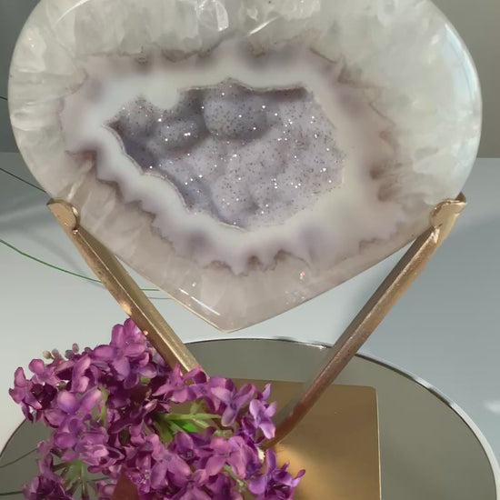 This breathtaking Agate Heart is a true statement piece — featuring soft ivory and blush banding that surrounds a sparkling lavender sugar druzy center.