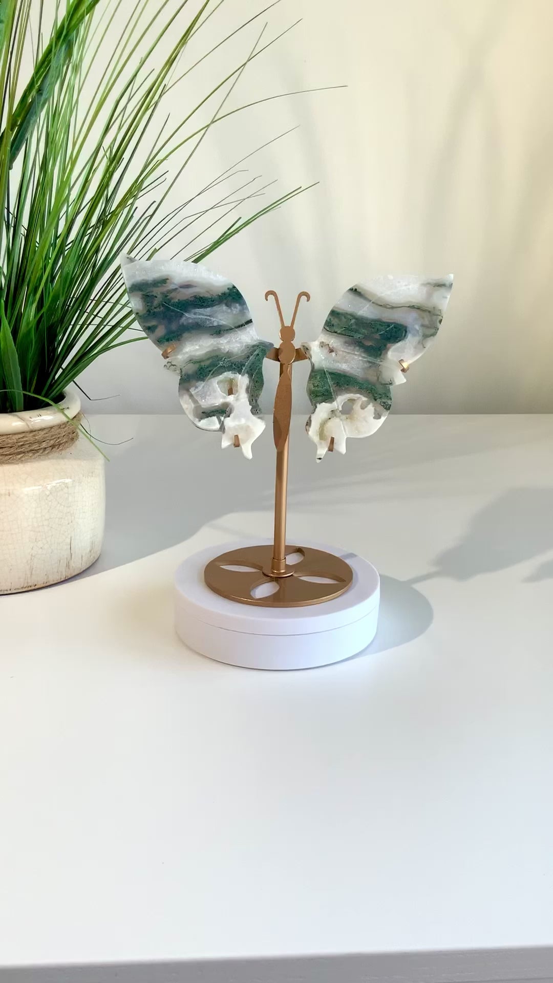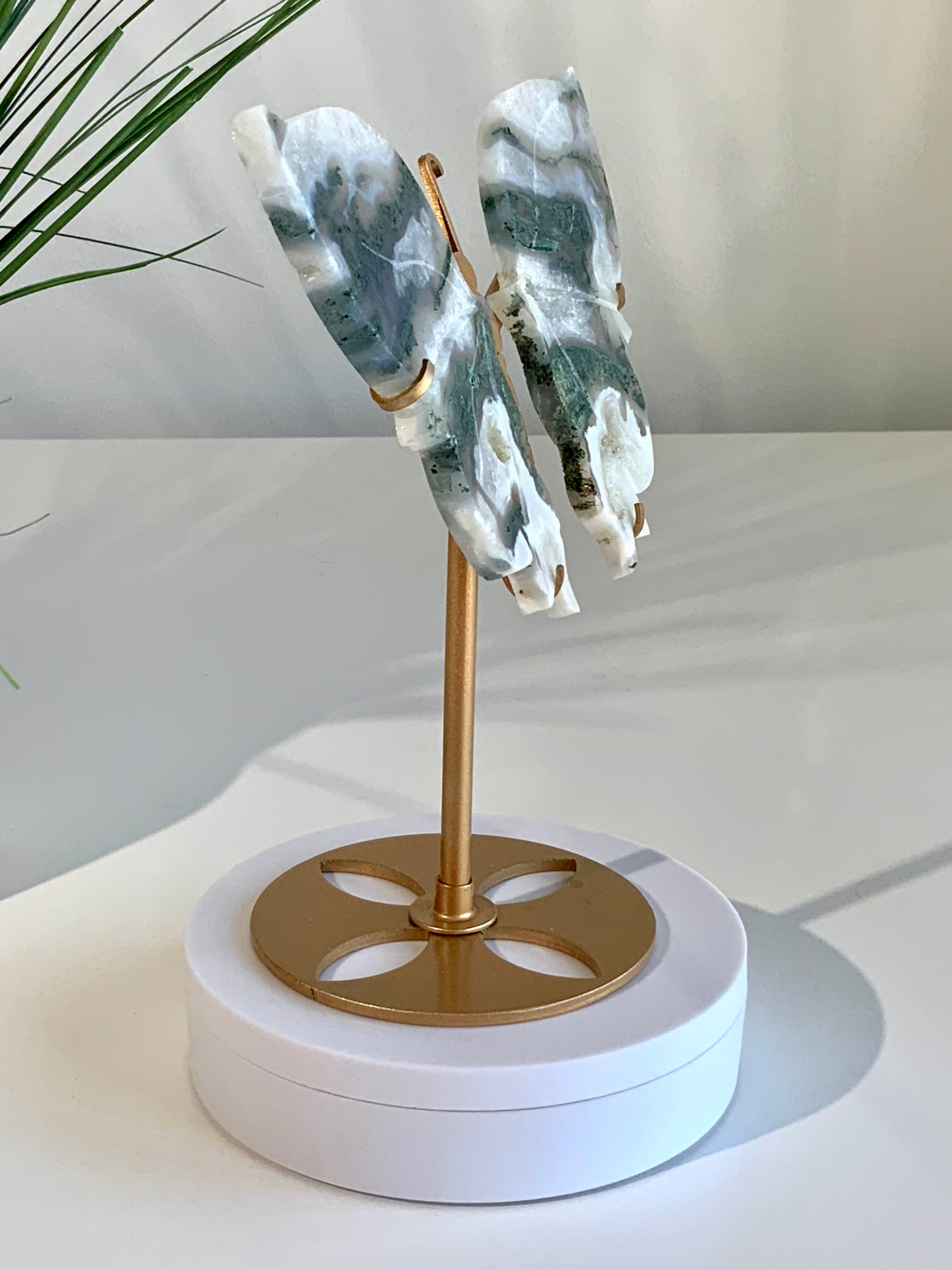 Displayed on a sleek gold stand, this piece is both a meaningful crystal ally and a stunning décor statement. No two butterflies are ever alike, making your piece truly one of a kind.