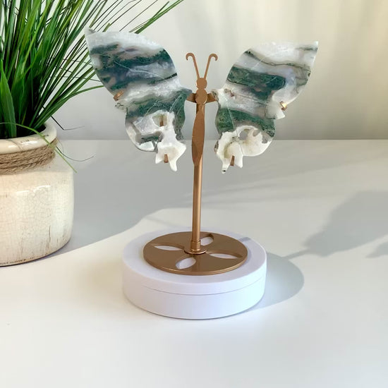 This enchanting Moss Agate Butterfly is a true symbol of transformation, renewal, and gentle growth. Hand-carved from natural moss agate, each butterfly features dreamy green inclusions floating through milky white stone—resembling lush forests, moss, and nature’s quiet magic.