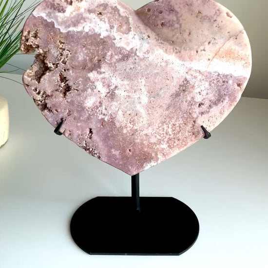 Carved into a timeless heart shape and displayed on a sleek metal stand, this piece radiates gentle, soothing energy while commanding attention in any room. This Pink Amethyst heart is one-of-a-kind, showcasing unique patterns, crystal pockets, and natural textures formed over millions of years.