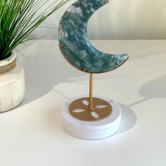 Moss Agate is deeply connected to nature, abundance, and emotional balance, making this moon perfect for anyone looking to bring calm, steady energy into their space. Displayed on a sleek gold metal stand, it’s both a powerful energetic tool and an elevated décor piece.