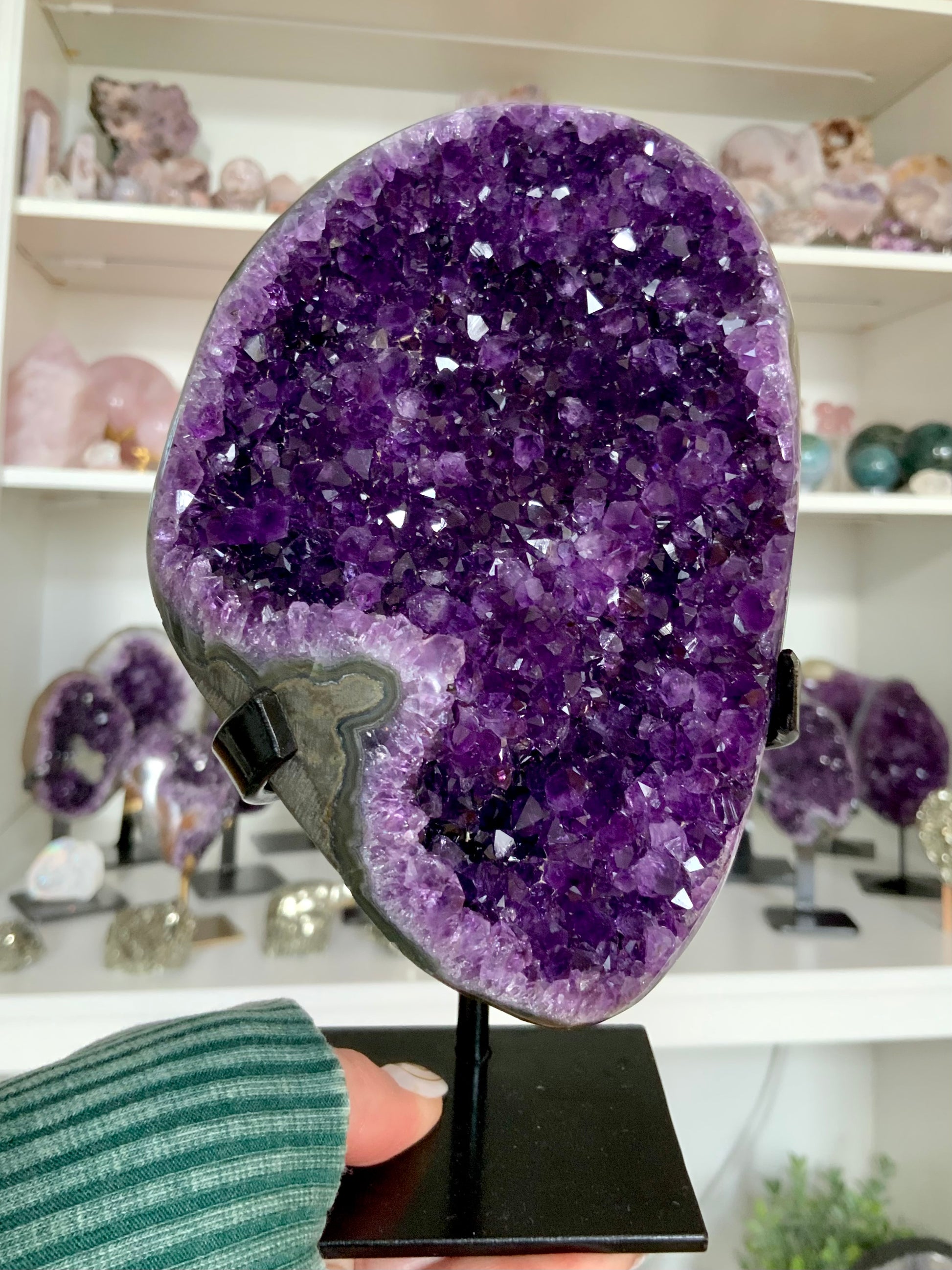 Sourced from the mineral-rich caves of Uruguay — home to some of the world's most intensely saturated amethyst — this stunning specimen arrives ready to display on its own natural or fitted stand. Each piece is a one-of-a-kind formation, shaped over millions of years into the deep violet clusters that Uruguay is celebrated for worldwide.